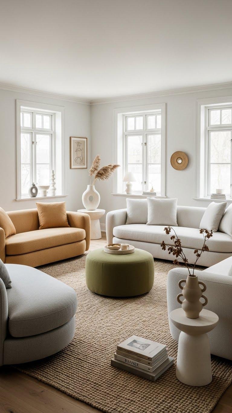 Lean into rounded coffee and tulip tables to soften corners and keep traffic flowing — they make a room feel modern without trying too hard.