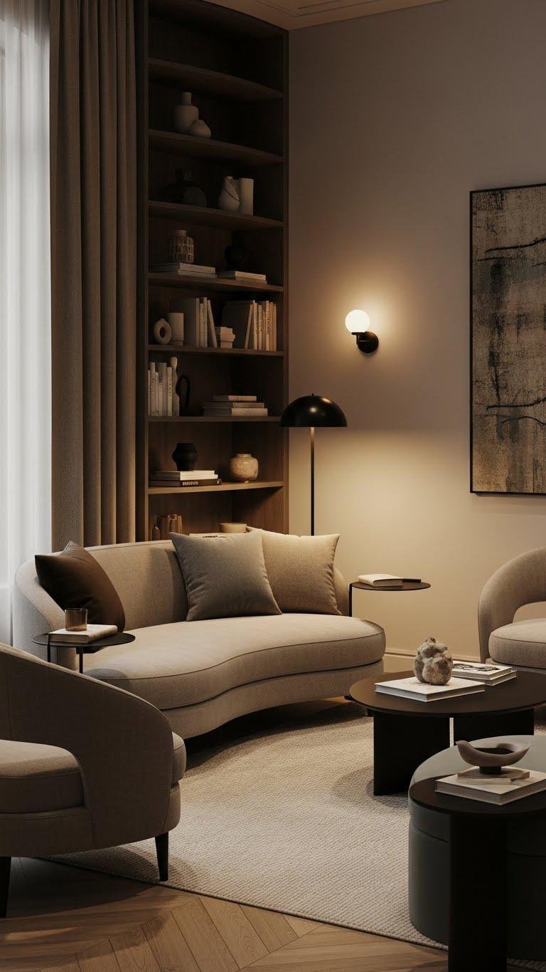 You’ll want a space that feels edited, tactile, and quietly luxurious—think chocolate brown velvet, creamy beiges, sage accents, and sculptural curves that invite you to slow down. Layer natural textures like bouclé and honed stone, temper light with voile sheers and dimmers, and add plants and brass details to keep it warm but restrained. Below are 23 focused ideas to help you shape that calm—start with one small change and watch the room settle.
