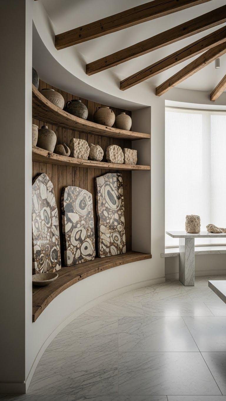 You’ll create a calm, liberated vibe by combining arched reading niches with sculptural scalloped shelving. Keep palettes muted, textures tactile, and furnishings minimal so each nook feels purposeful, uncluttered, and inviting—your private pause within an open life.