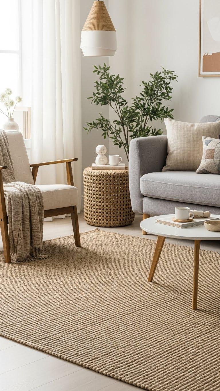 Choose a high-quality wool or tightly woven rug to anchor your space; you’ll get natural durability, subtle texture, and effortless warmth that complements minimal decor.