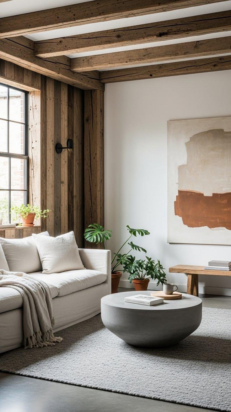 After you’ve layered matte and soft sheens for tactile depth, bring in reclaimed wood to anchor the room with history and warmth.