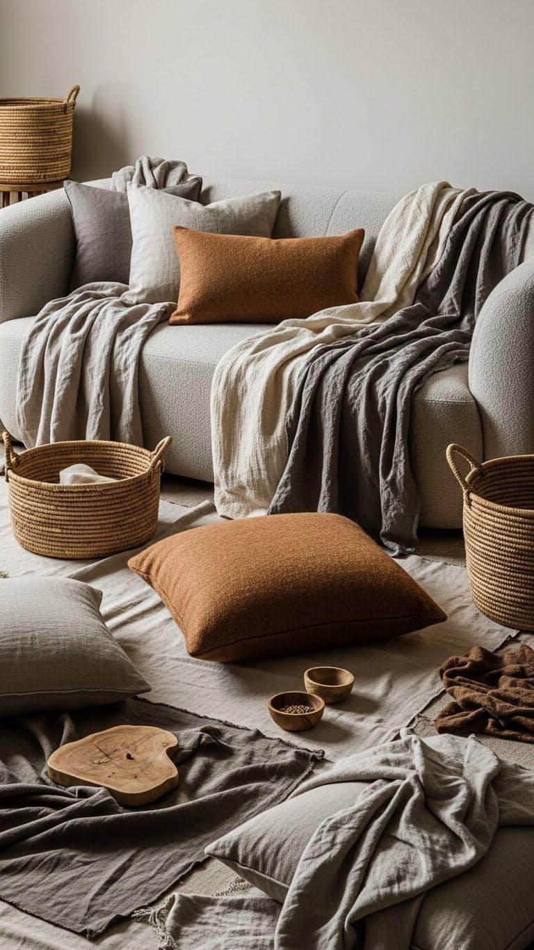 Place handwoven baskets nearby for storage and texture. You’ll create a relaxed, tactile palette that reads effortless — practical, freeing, and simply inviting to touch and live in.