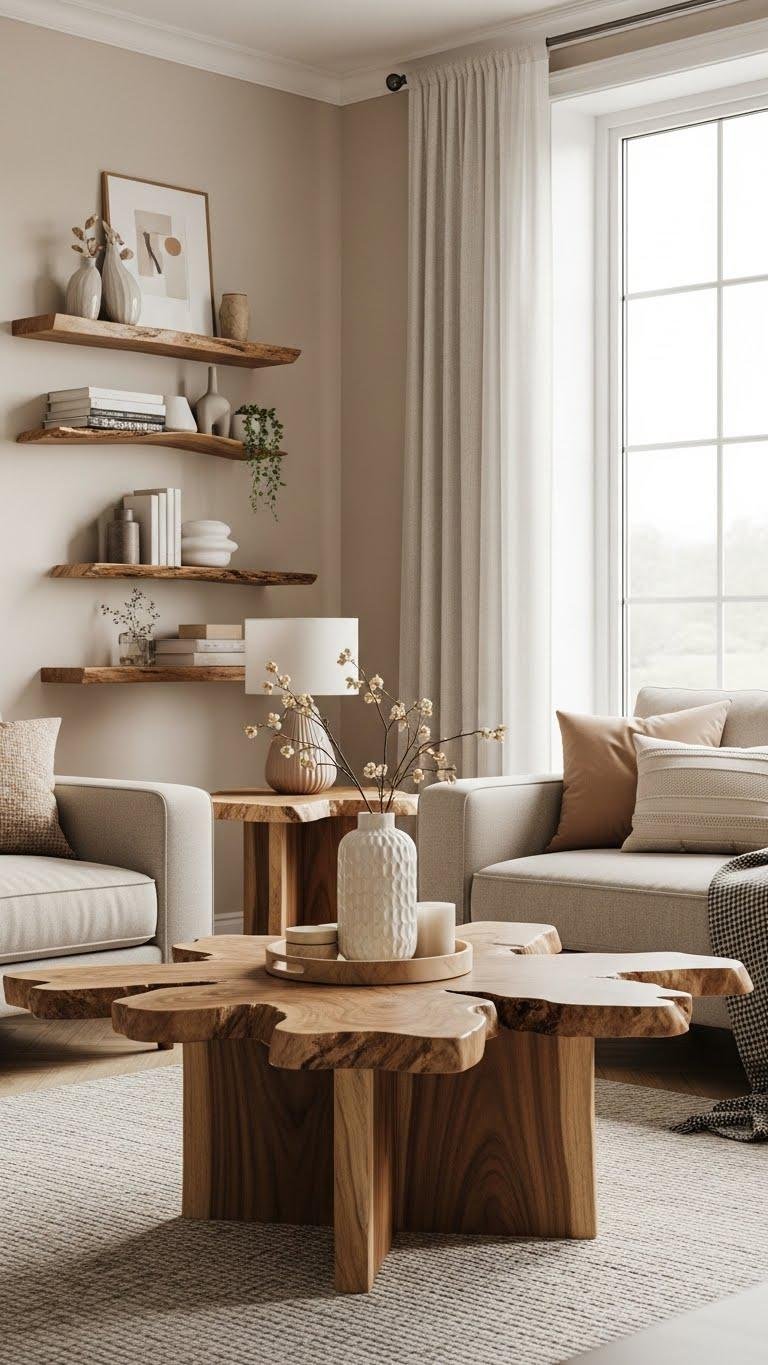 Introduce a live-edge wood piece to anchor your mocha mousse palette—its organic silhouette and visible grain bring instant warmth and sculptural interest without overwhelming the space.