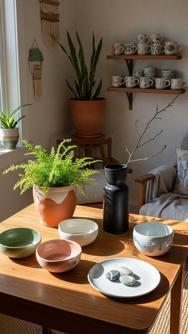 Introduce ceramic and handcrafted pottery to bring tactile warmth and quiet artistry into your space. Choose pieces with organic shapes and handmade glazes that read honest and calm.