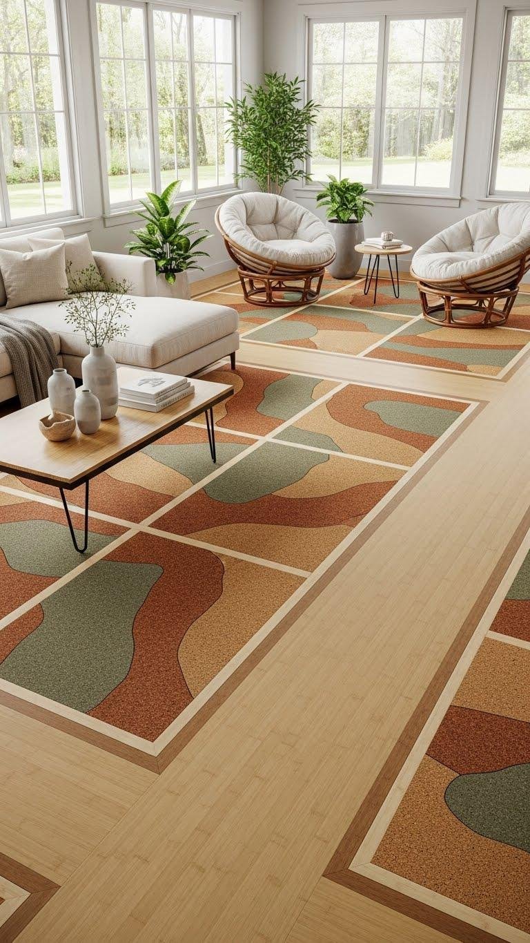 Swap in cork or bamboo accents to warm a room without overpowering it. You’ll layer texture and comfort with cork mosaics around seating or entryways, and subtle bamboo inlays to define pathways or zones.