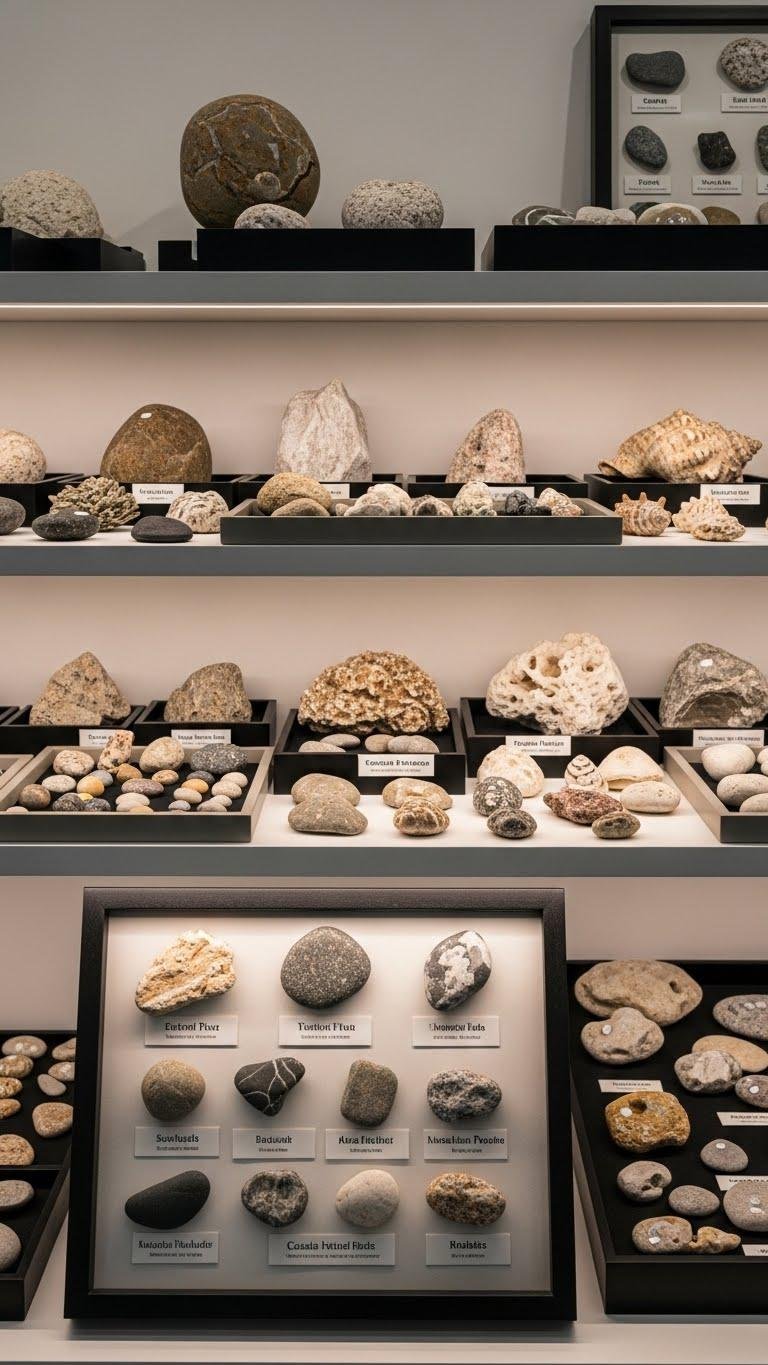 Lay out a small, edited selection of stones and shells so each piece can be seen and appreciated—Group them by size, color, or texture on shallow trays, open shelves, or a dedicated shadow box to create calm, museum-like vignettes.