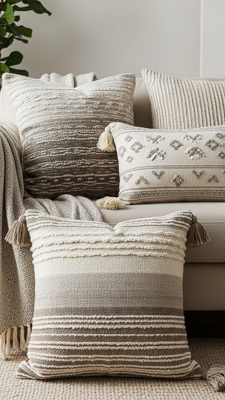 You’ll mix woven gradients and neutral textures—linen, wool, cotton—for depth.