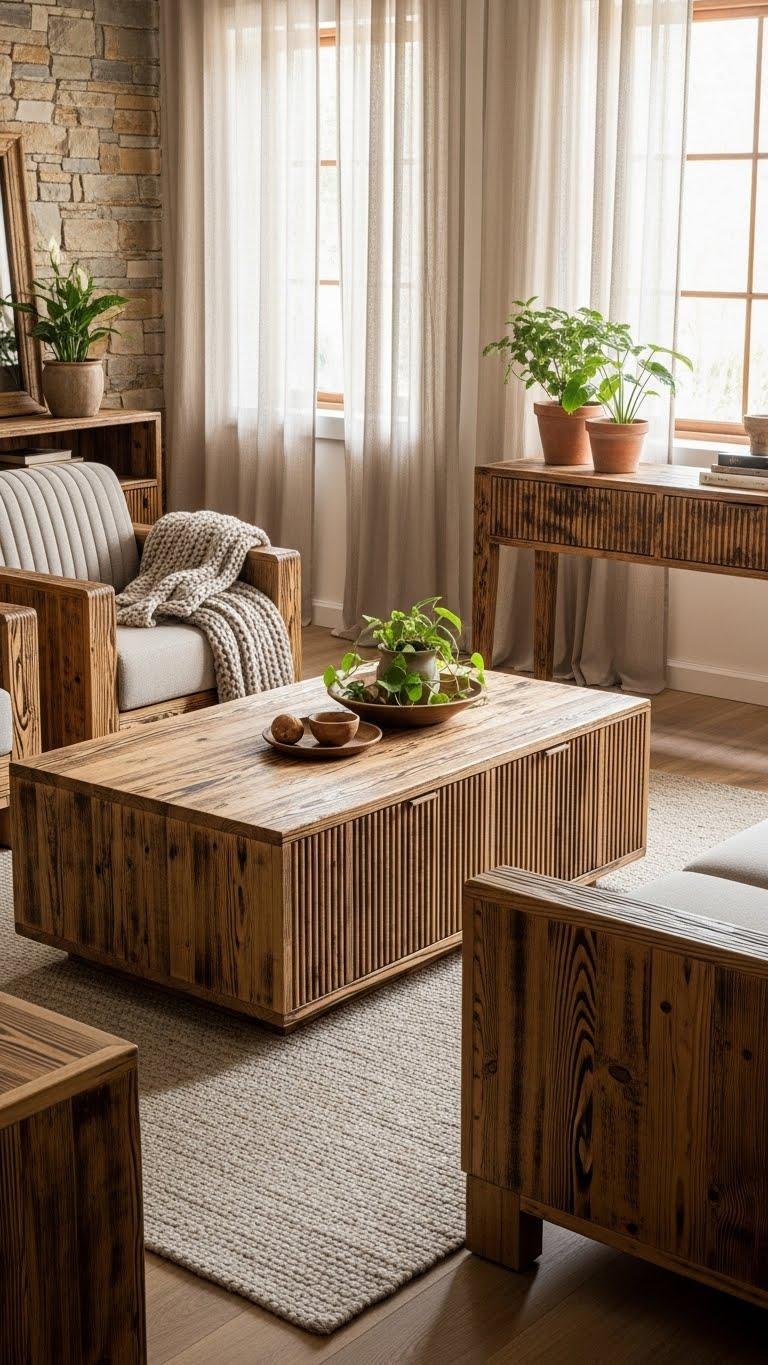 Having fluted wood panels set the tone, bring that same warmth and story into your furniture by choosing reclaimed wood pieces. You’ll favor items with rustic joinery and a subtle charred finish for texture and durability.