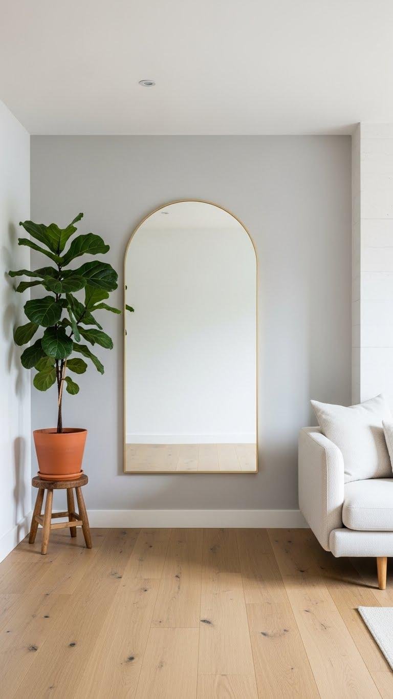 You’ll choose arched frames that echo natural forms, place the mirror to catch light, and create reflective softness without clutter. This simple move widens sightlines, frees visual tension, and keeps the space calm and unfussy.