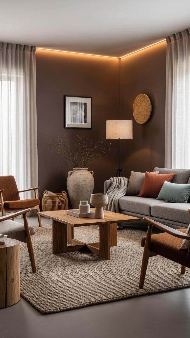 You’ll create a Chocolate Ambiance that feels liberated—mix matte walls with Velvet Pairings like rust or muted teal cushions. Keep furniture streamlined, add tactile rugs, and let light soften contrasts for effortless, modern comfort.