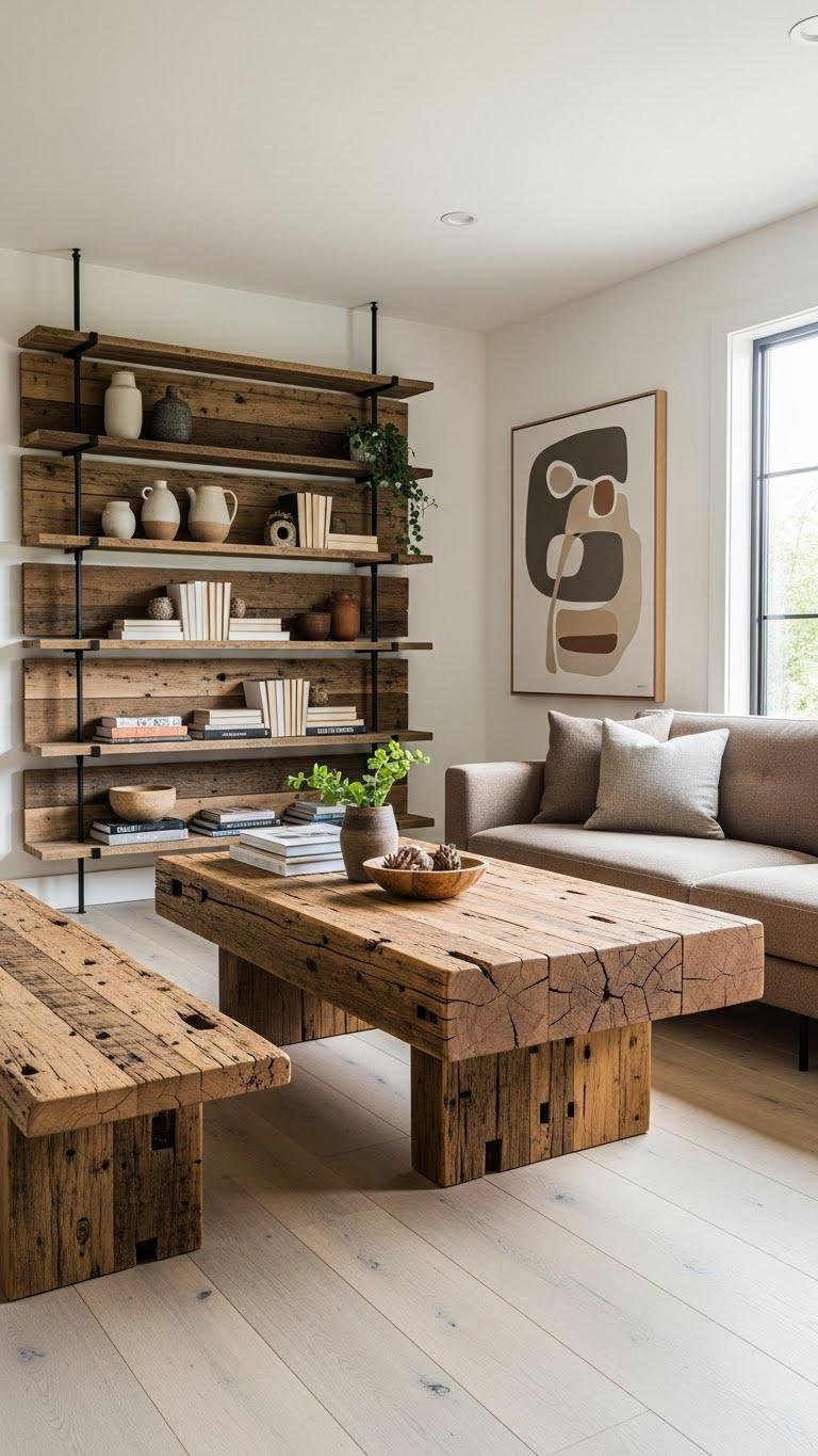 Reclaimed-wood furniture brings instant character and sustainability to soft decor, so pick pieces that celebrate patina, knots, and hand-hewn marks rather than hiding them.