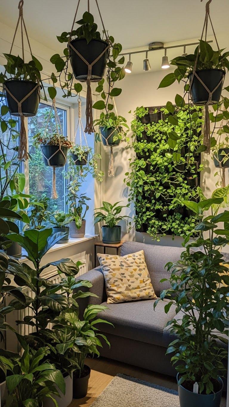 Embrace hanging planters to free floor space and craft intimate nooks.