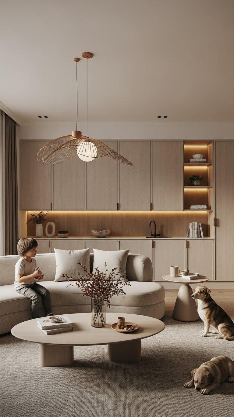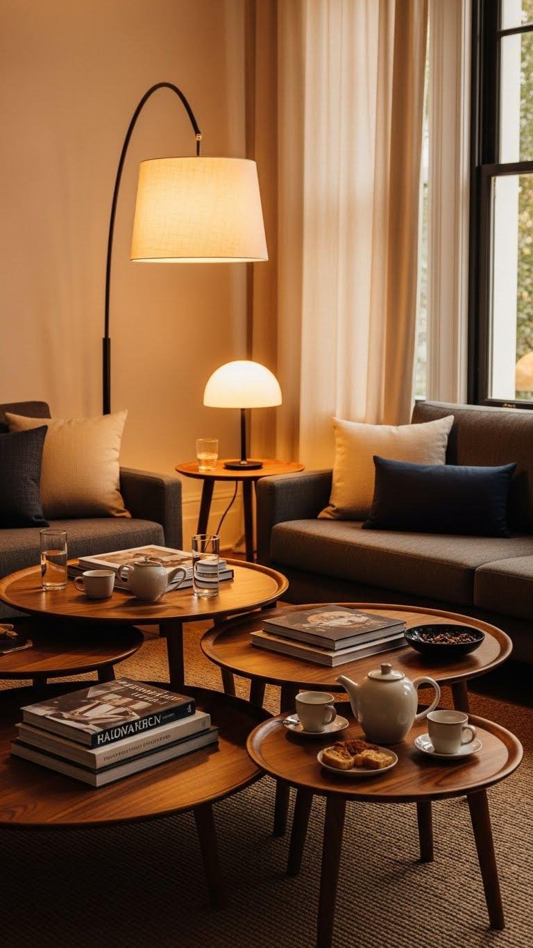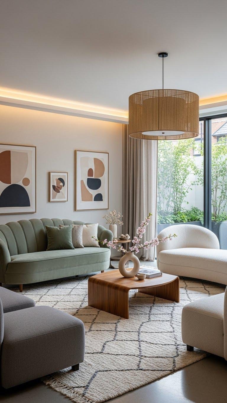 Curved seating invites matching curves underfoot: opt for circular coffee tables and rugs to reinforce that soft, communal geometry. You’ll create flow and ease, pairing round ottomans and circular poufs for flexible seating and layered texture.