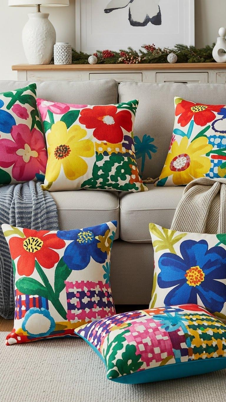 Bring in bold printed cushions to punch up playfulness and anchor your soft decor with confident pops of pattern. You’ll mix pattern scale confidently—pair oversized motifs with smaller geometrics—to create rhythm without clutter.