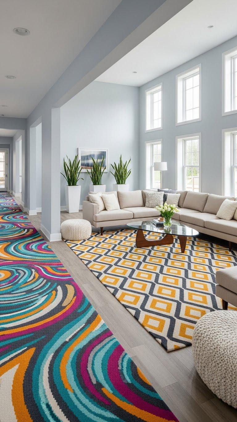 Mix scale and texture, keep surrounding tones calm, and let that bold carpet give your space freedom, movement, and modern personality.