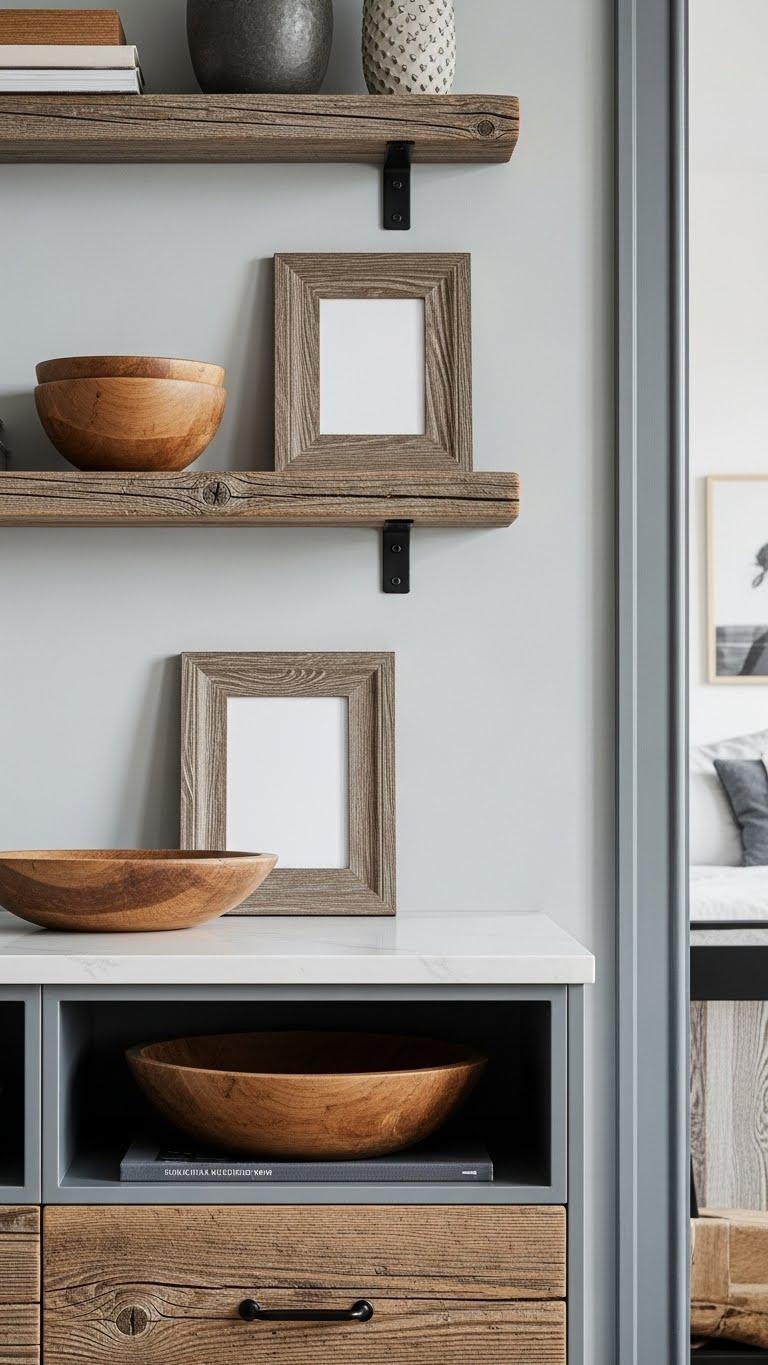 Choose reclaimed shelves, bowls, or frames that celebrate patina grainscape and subtle timber knotwork. You’ll keep lines clean, finishes muted, and pair pieces with airy neutrals so the wood feels purposeful, relaxed, and free rather than heavy or staged.