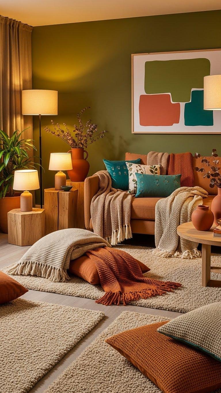 Soft rugs and textured throws set the tactile tone; now pick a color story that keeps that warmth feeling modern and relaxed. You’ll anchor rooms with an earthy undertone—sandy beiges, clay browns, olive greens—then introduce accented neutrals and deliberate pops in terracotta or teal.