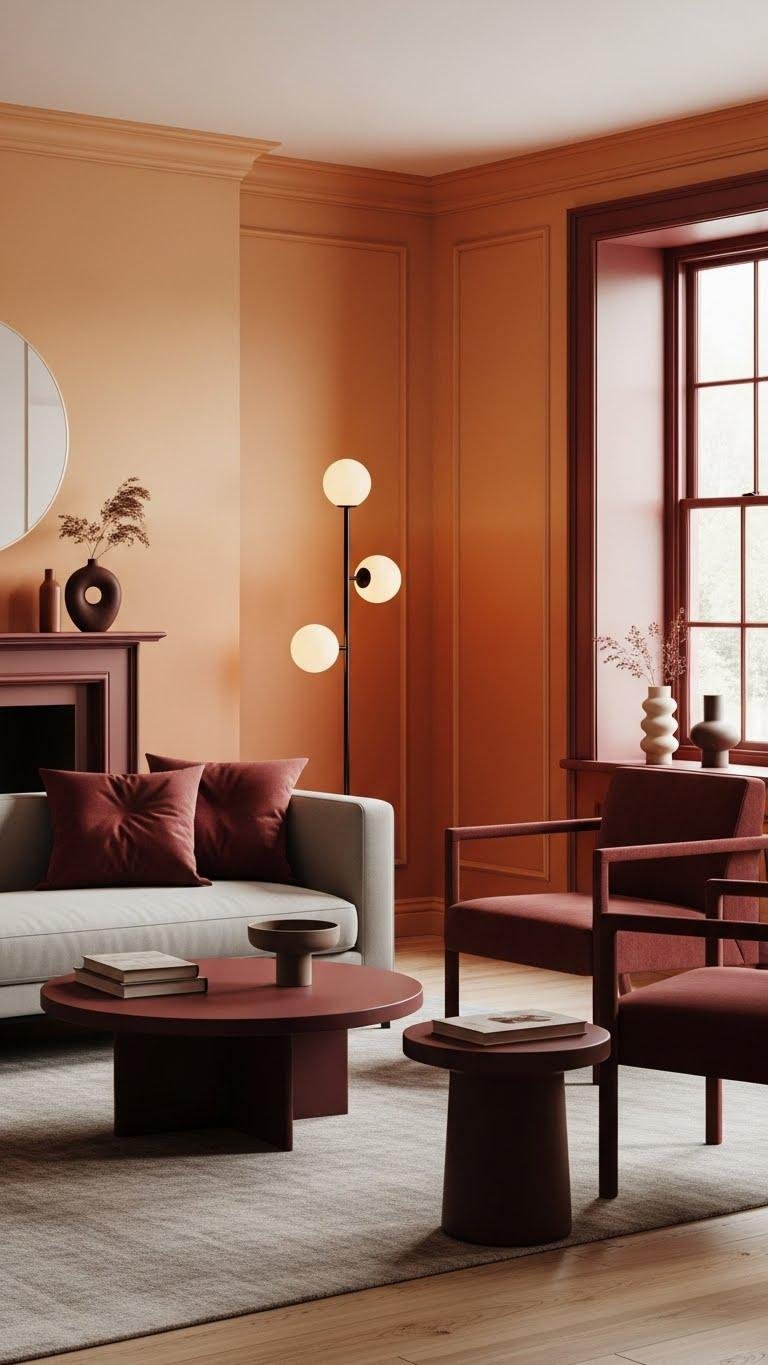 Though bold, ochre and oxblood work together to build moody depth without feeling heavy, so you can layer rich color and still keep spaces modern and wearable. You’ll use ochre gradients on walls or textiles to create warmth, then add oxblood accents in pillows, trims, or small furniture to anchor the room.