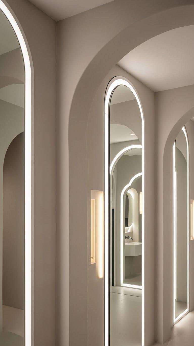 You’ll create calm, flowing sightlines by carving arched niches into walls or installing mirrored panels to bounce light and expand space. Choose slim frames or plastered recesses for a modern, liberated feel.