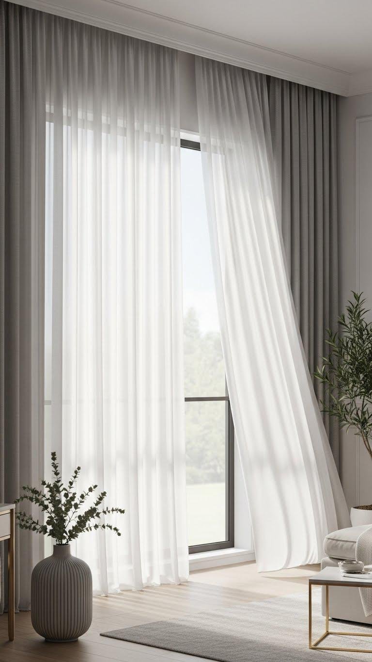 You’ll enjoy sunlight filtering that feels effortless; sheer layering adds texture and movement while preserving a privacy balance.