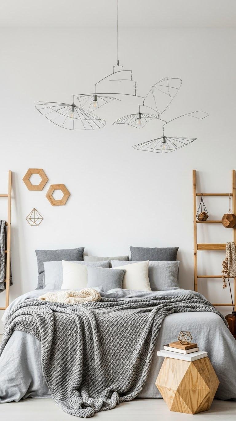 After layering soft linens and knits, bring in a sculptural wire or wooden chandelier to lift the room’s silhouette and add architectural interest. Choose a metal mobile for airy movement or wooden geometric pendants for warm structure.