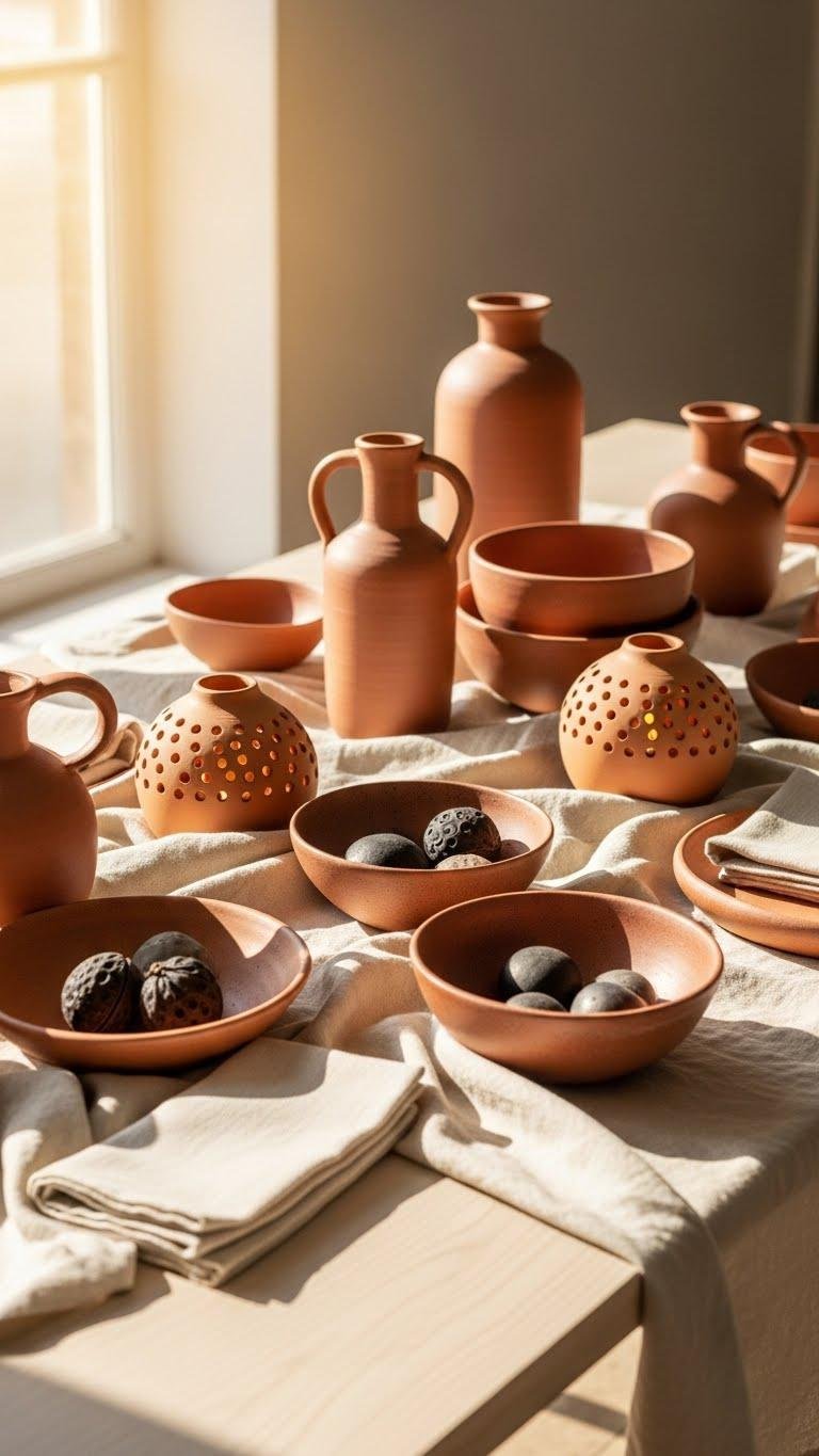 Bring warmth into your scheme by layering terracotta and cream accessories that feel both grounded and modern. You’ll mix terracotta glazing vases, clay lamps, and artisan bowls with linens showing a soft cream patina for effortless contrast.