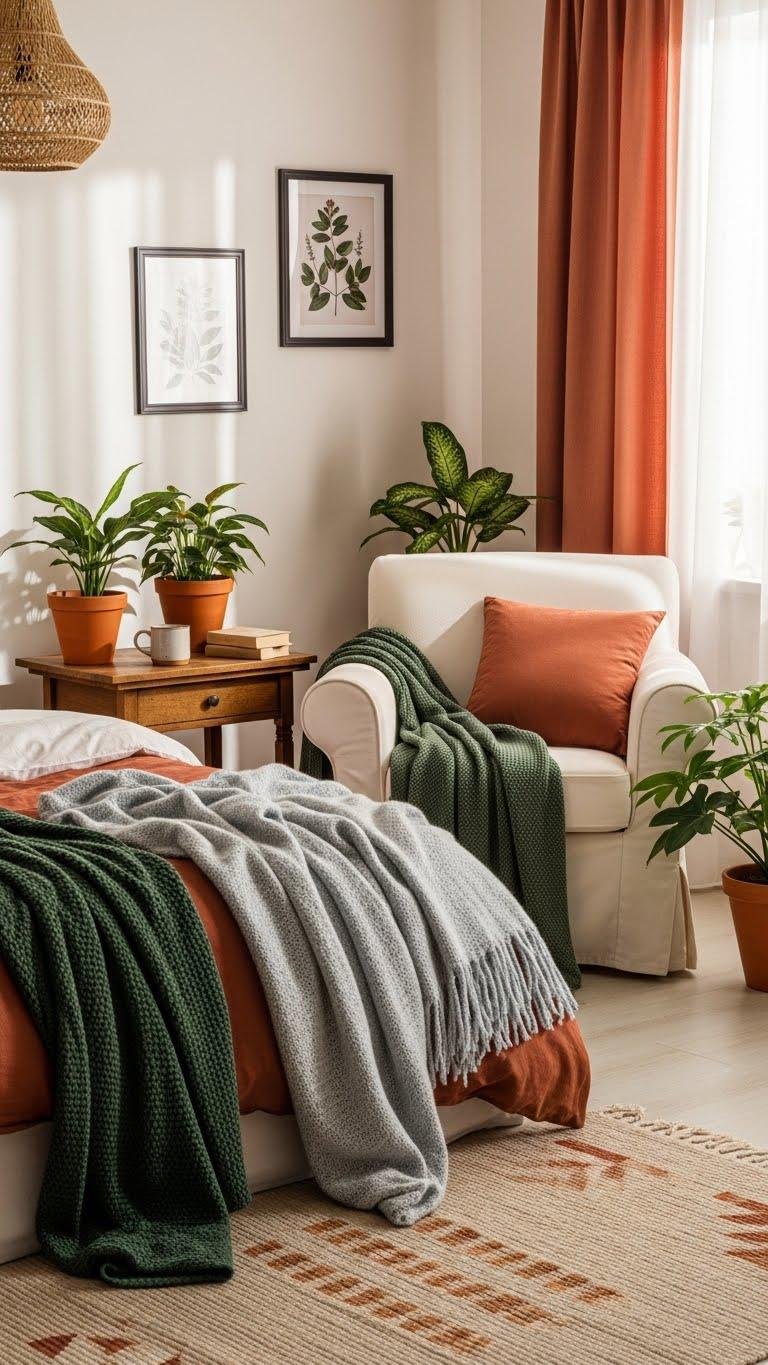 To balance the warm terracotta and cream palette, add cozy throws in forest green or pale blue to anchor the bed and seating areas. You’ll layer texture that feels like forest walks and evokes calm through color psychology, letting you choose bold grounding or airy lightness.