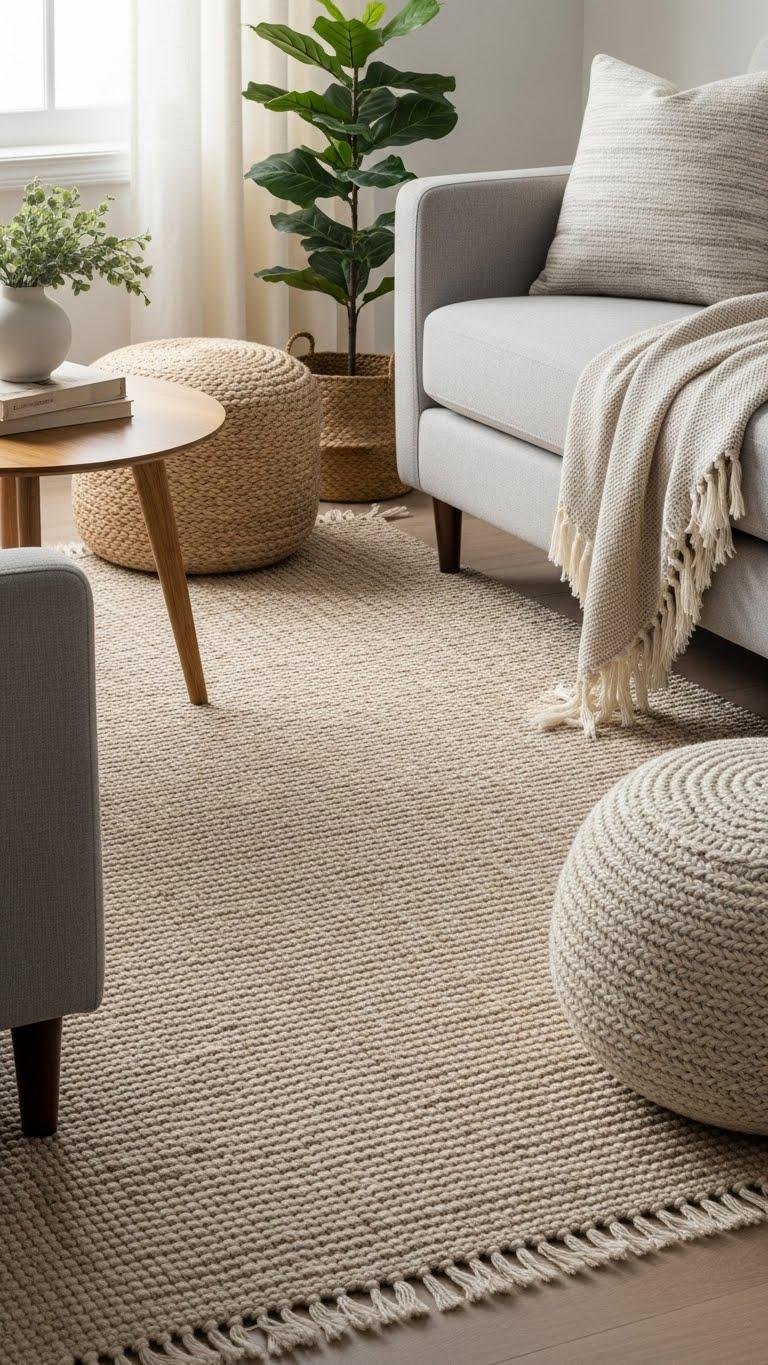 Anchor the room with a wool or jute rug to add instant texture and warmth underfoot. You’ll choose handwoven textures that feel grounded and free, mixing rich weave patterns with soft neutrals. Natural fibers bring durability and low-maintenance charm, so you can move freely, bare feet and all.