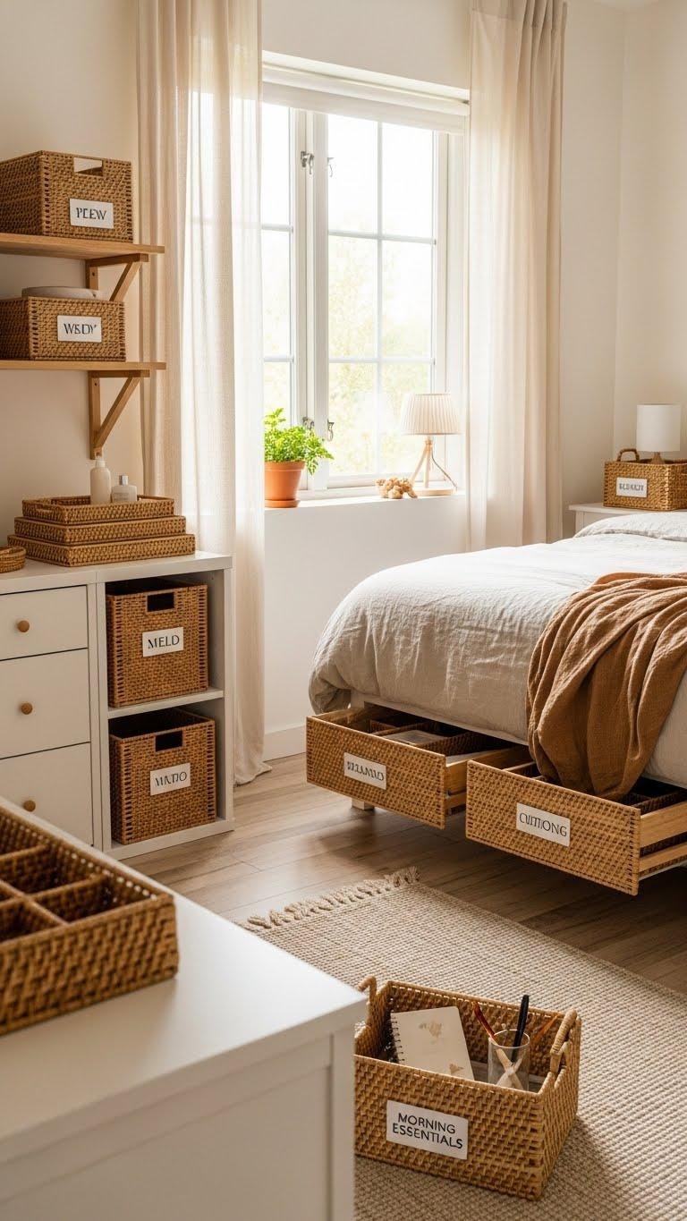 Bring woven rattan storage into your bedroom to add organic warmth and smart function without fuss. You’ll use label baskets for quick sorting and keep surfaces calm.