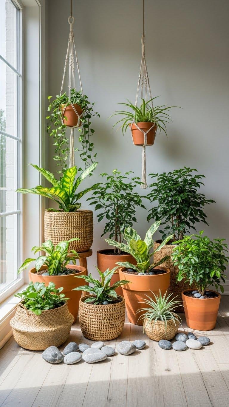 Once you’ve picked low‑maintenance, air‑purifying plants, style them in natural planters to amplify their calm, organic vibe. Mix clay pots, woven baskets and hanging macramé for layered texture.