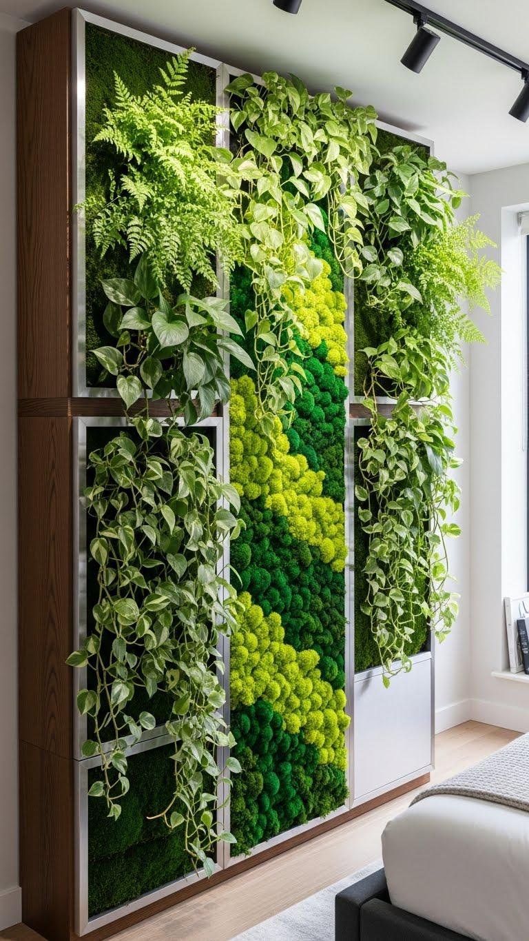 You’ll choose a vertical mosswall for low maintenance, mix ferns and a cascading pothos for movement, and add modular frames so you can rearrange freely.