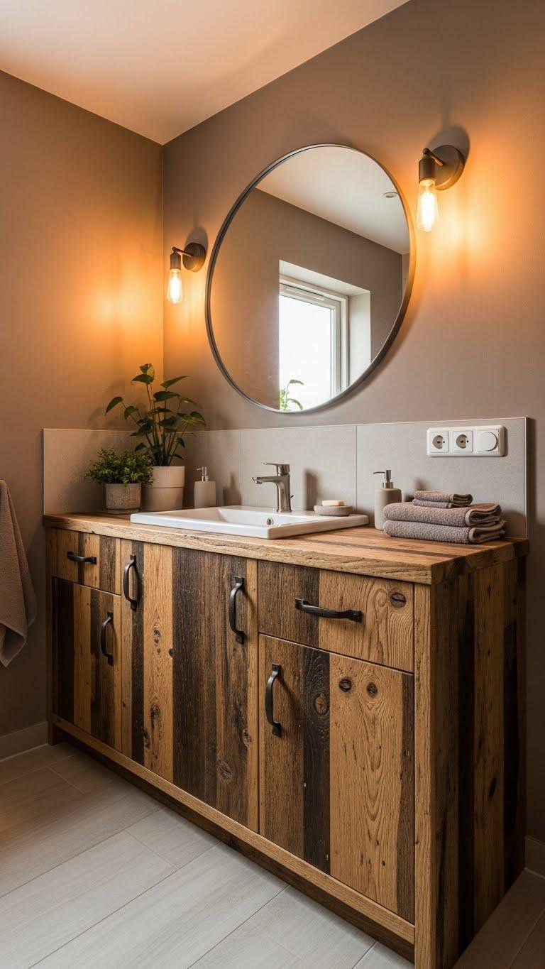 If you love the warmth of mocha mousse walls, bring that same lived-in depth into bathrooms and powder rooms by installing a reclaimed wood vanity that echoes the room’s tonal story.