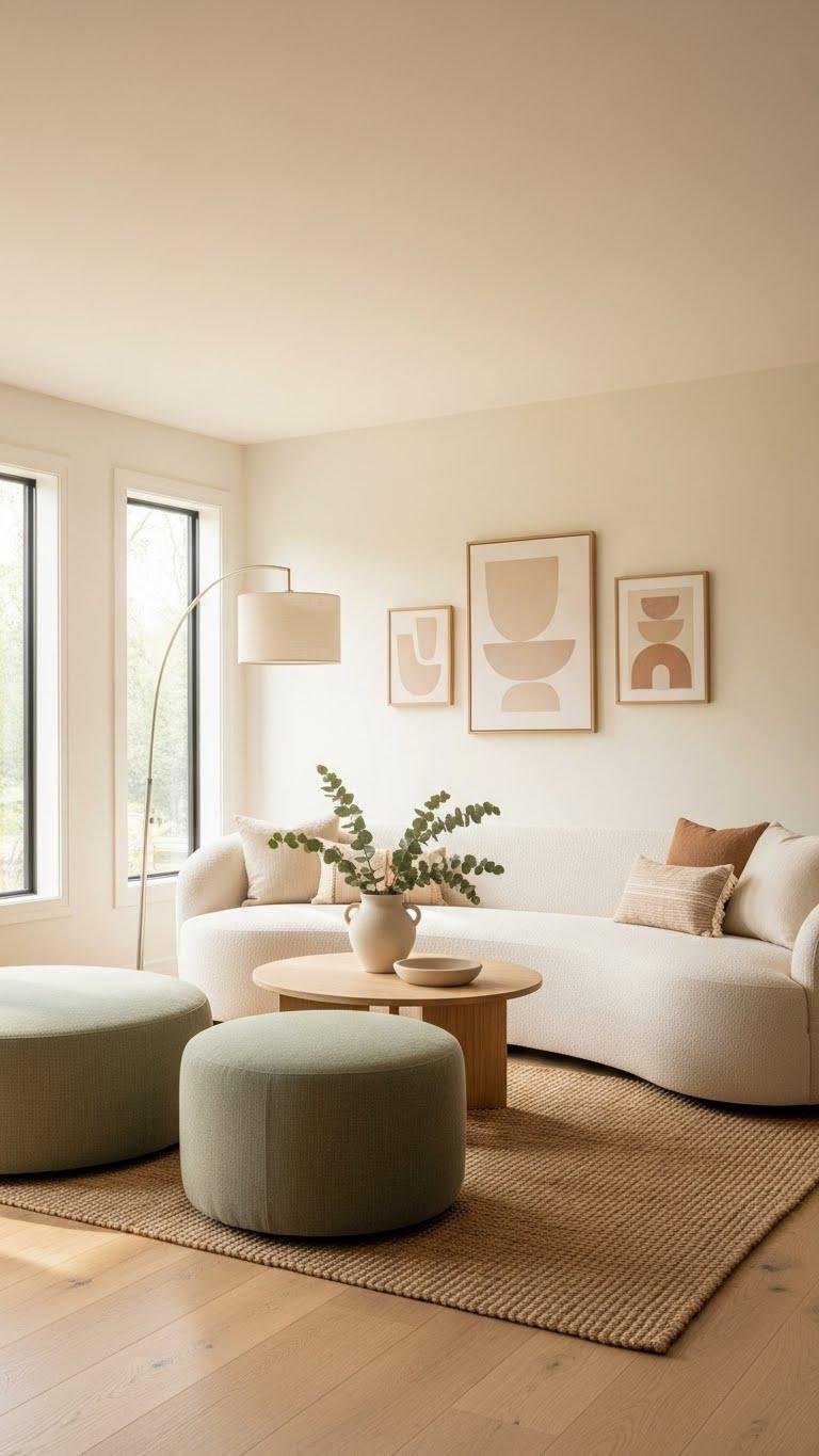 You’ll favor a curved sofa and rounded ottomans to soften corners, encourage flow, and create intimate seating clusters.