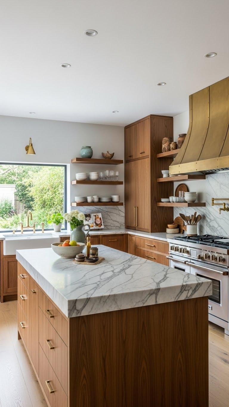 Contrast makes a kitchen sing: pair cool marble countertops with warm wood cabinetry to balance luxury with lived-in comfort.