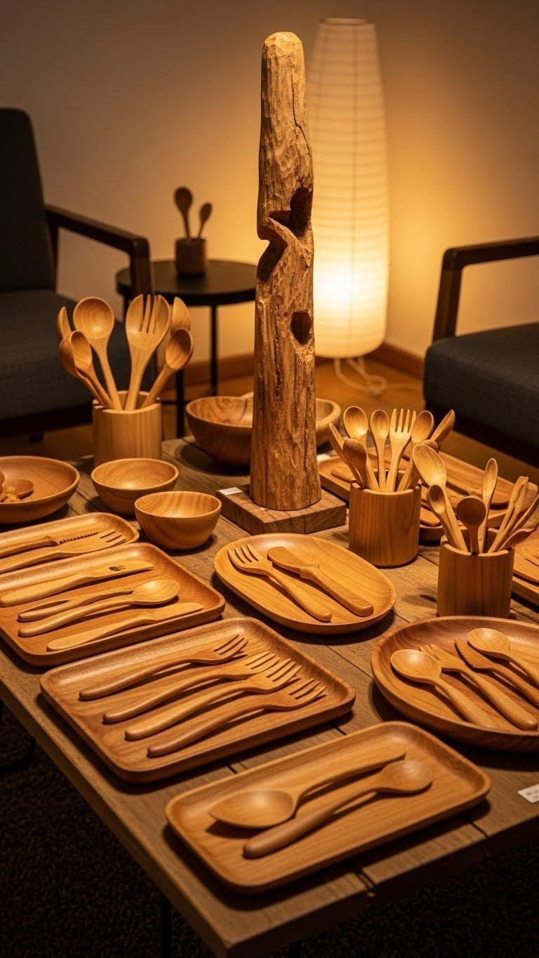 Choose handcrafted utensils, bowls, and trays for daily use; display wooden sculptures as focal points.