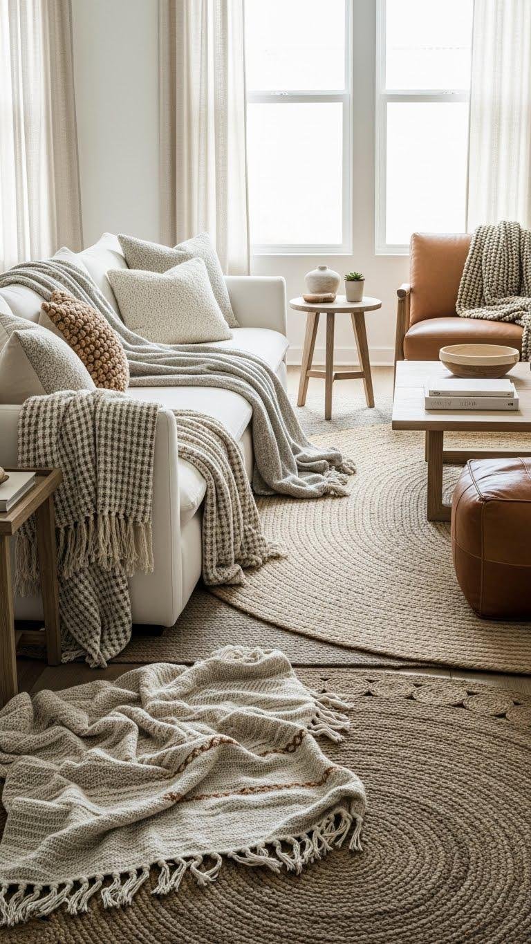 You’ll use tactile layering—woven throws, boucle cushions, sisal rugs—and mix matte woods and soft leathers. Choose cozy textiles in muted palettes, vary scale and pile, and let each element invite touch while keeping spaces airy and unconfined.