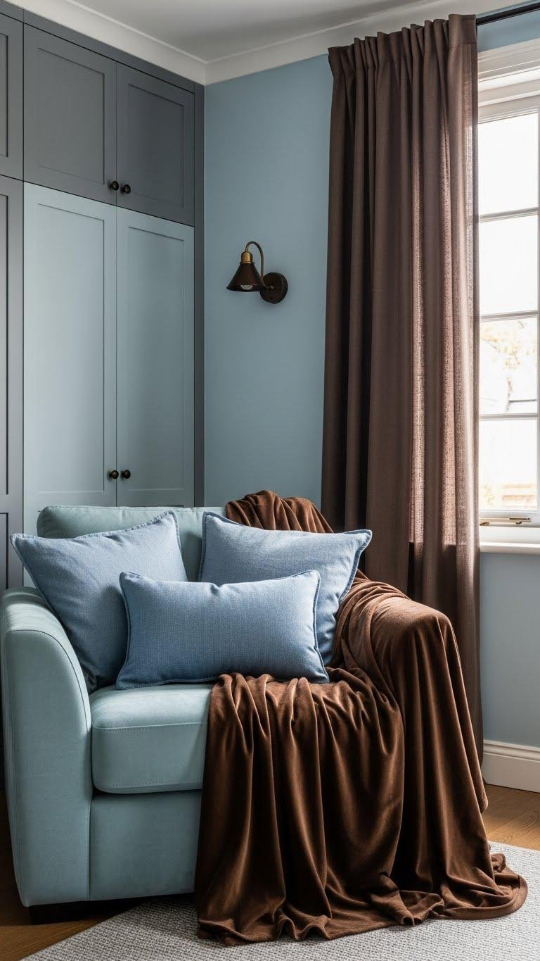 A soft blue palette paired with rich chocolate brown gives your room instant depth and warmth without feeling heavy; the cool, airy qualities of slate, powder, or duck-egg blues create visual breathing room while chocolate anchors the scheme and highlights texture.