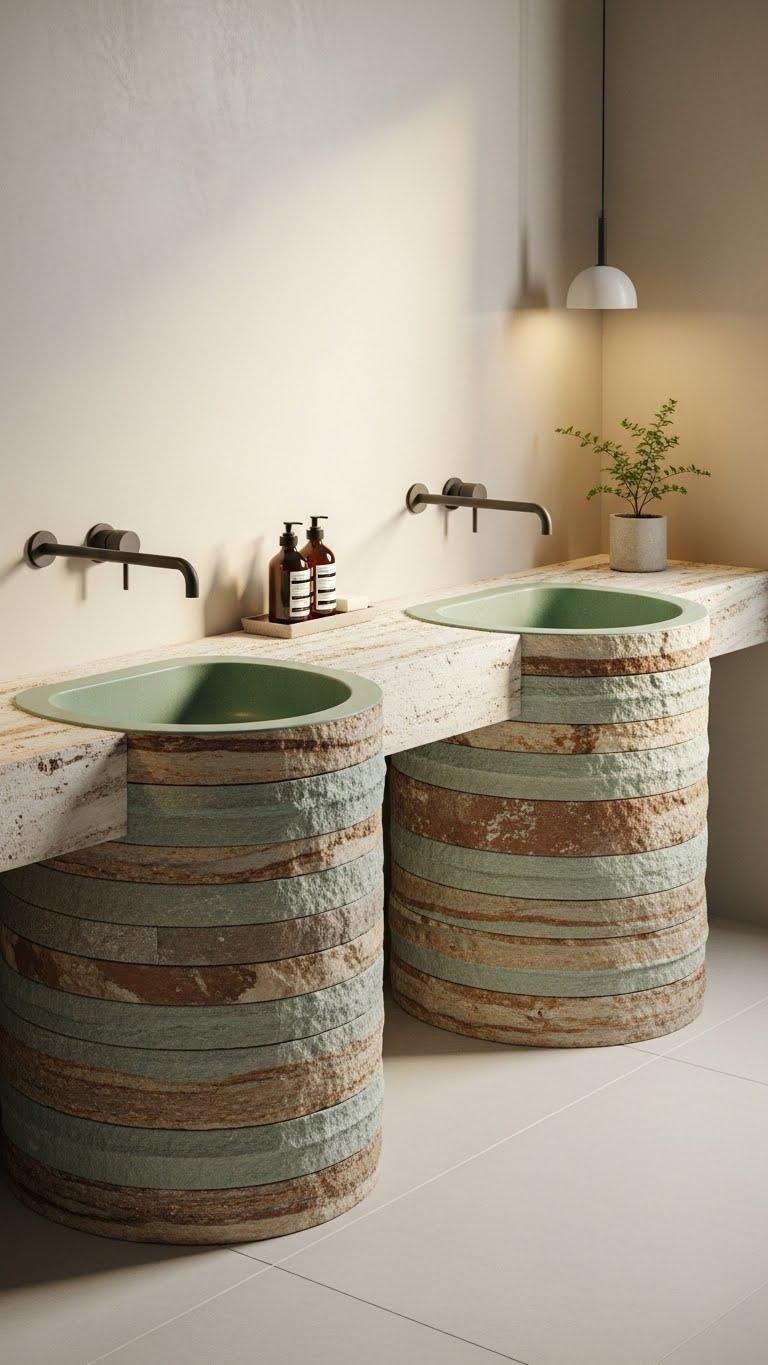 Pairing layered stone with a subtle pop of color keeps the palette grounded while adding quiet personality—step in sage NativeStone sinks to do this with restraint. You’ll choose sage sinks whose subtle hue complements stone basins, letting muted greens read sophisticated rather than loud.