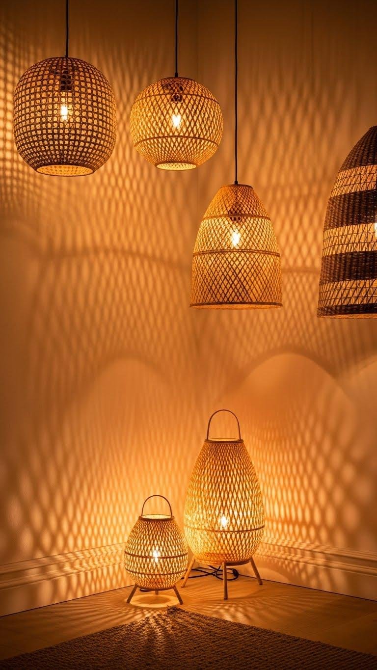 Just as terracotta brings tactile warmth to a corner, woven rattan lighting adds sculptural warmth from above, casting patterned shadows and softening harsh bulbs.