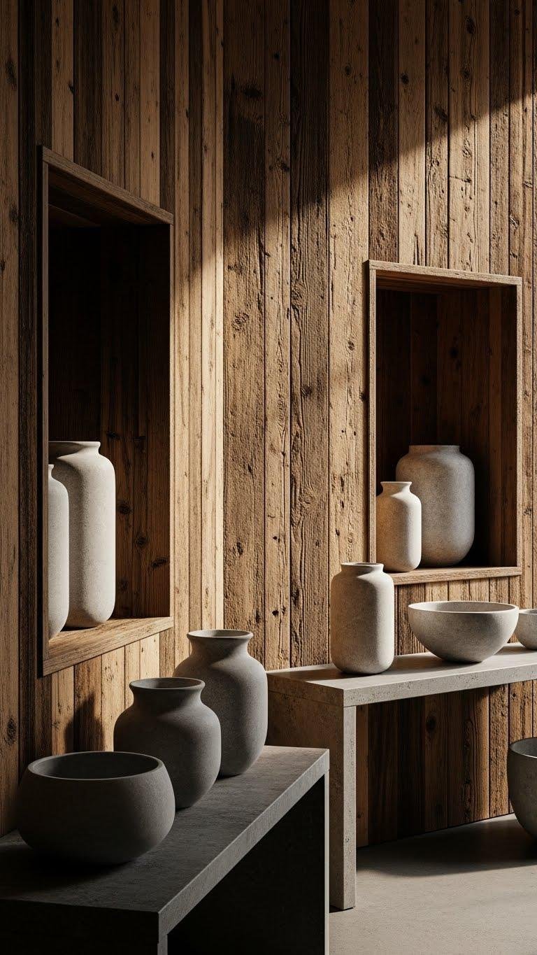 Moving from a reclaimed wood wall to tactile decor, stone vases and bowls bring a grounded sculptural presence that complements warm timber without competing with it.