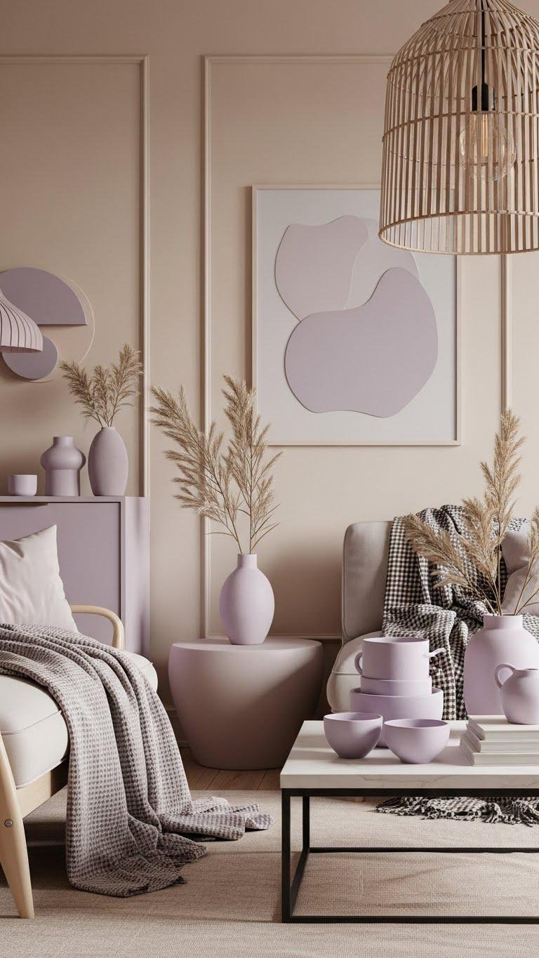 You’ll pick muted lavender accents against warm beige walls, then layer textured throws and matte ceramics. Choose simple shapes, let light play across surfaces, and keep circulation open. The result: a restrained, airy space that feels personal and unburdened—effortless freedom.