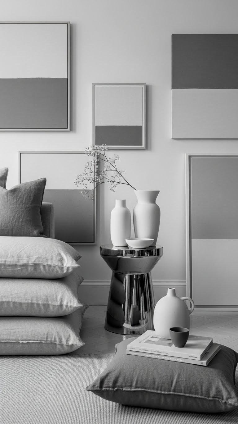 You’ll mix monochrome textures—linen cushions, matte ceramics, a glossy side table—to keep interest while staying restrained. Add tonal artwork to anchor the scheme and guide furniture choices.