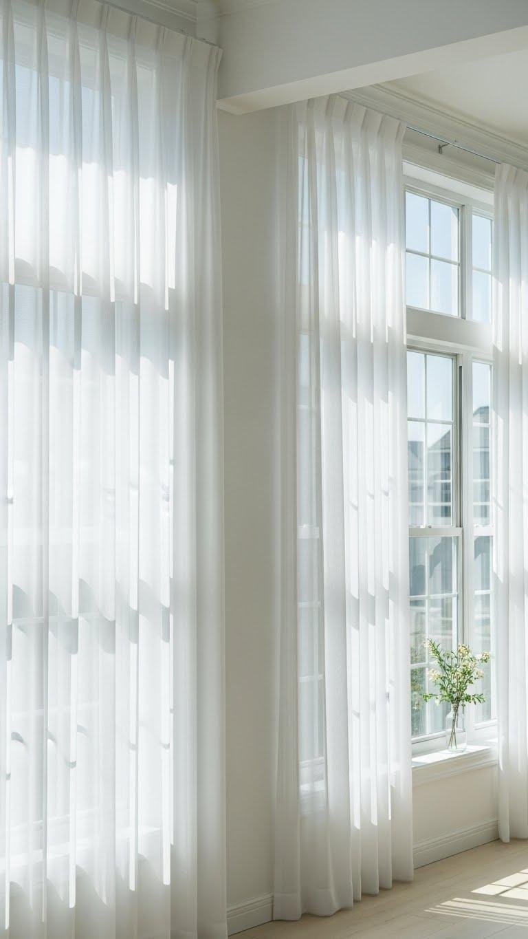 Sheer white curtains filter light without blocking it, giving windows a soft, airy frame that instantly makes a room feel calmer and more spacious.