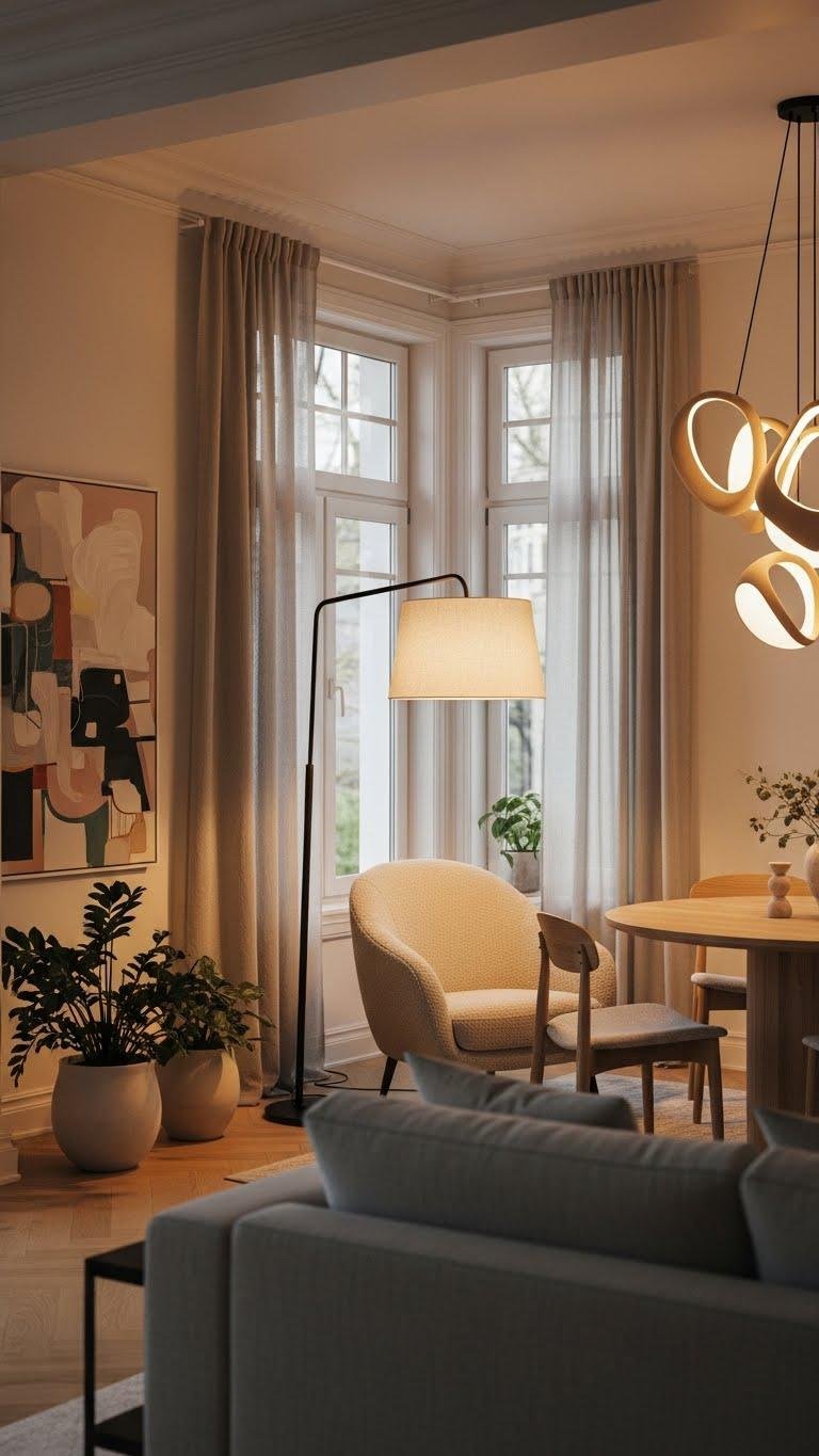 While soft curtains calm a room, bold lighting gives it personality and structure. Choose statement fixtures that anchor zones—an oversized floor lamp by a reading chair, sculptural pendants above the dining table.