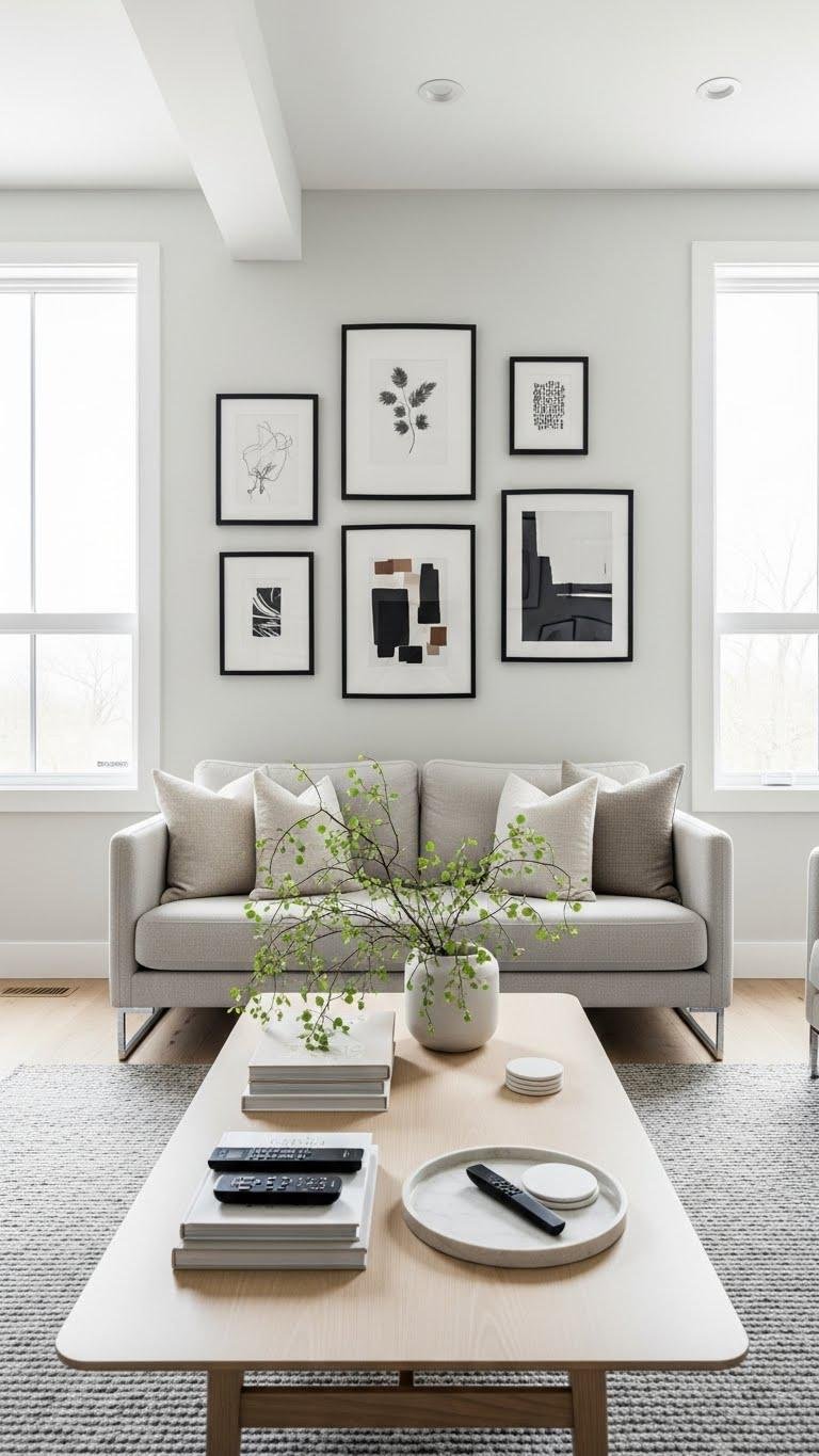 Black frames sharpen your walls; keep the coffee table low and minimal to let that clarity land in the room.