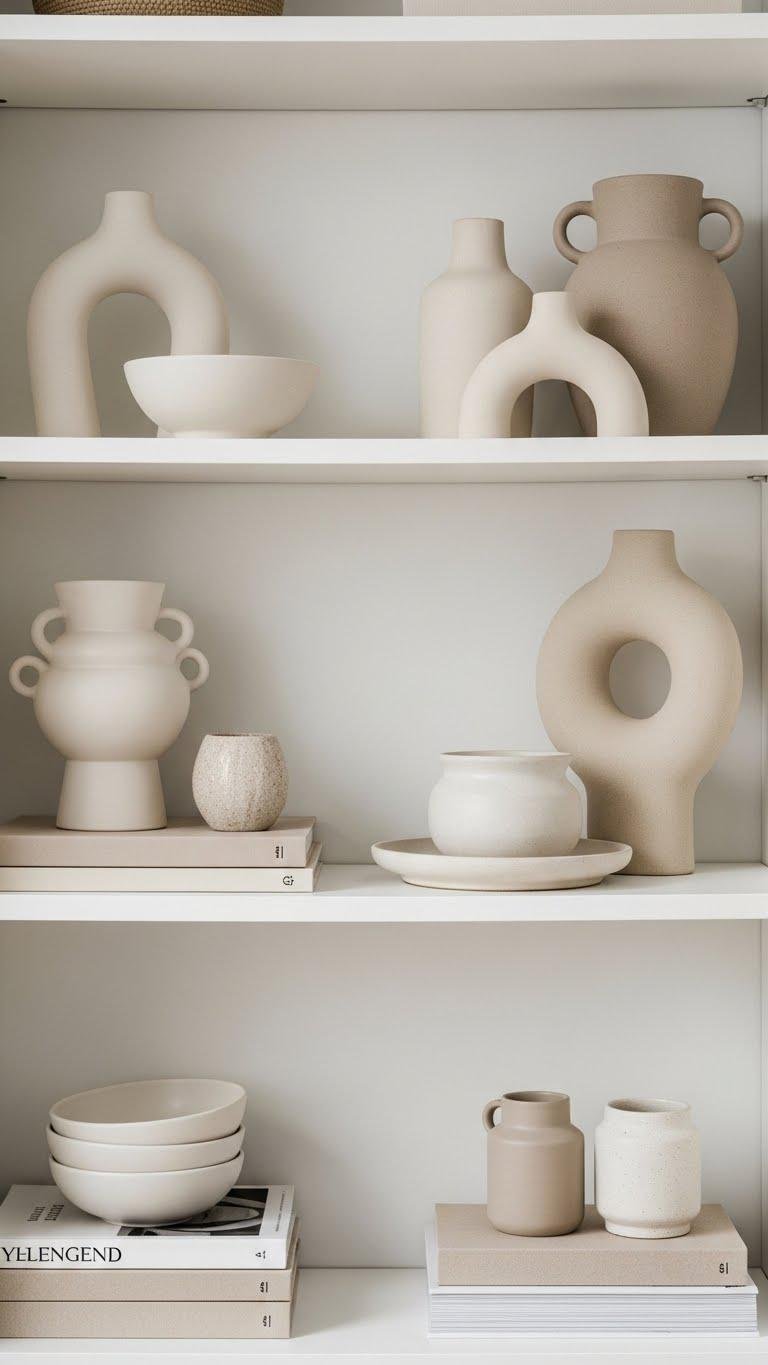 Often you’ll want to treat open shelves like a small gallery: space out a handful of curated pieces so each one can breathe. Choose curated ceramics and sculptural vases in neutral tones, mix heights and textures, and leave negative space.
