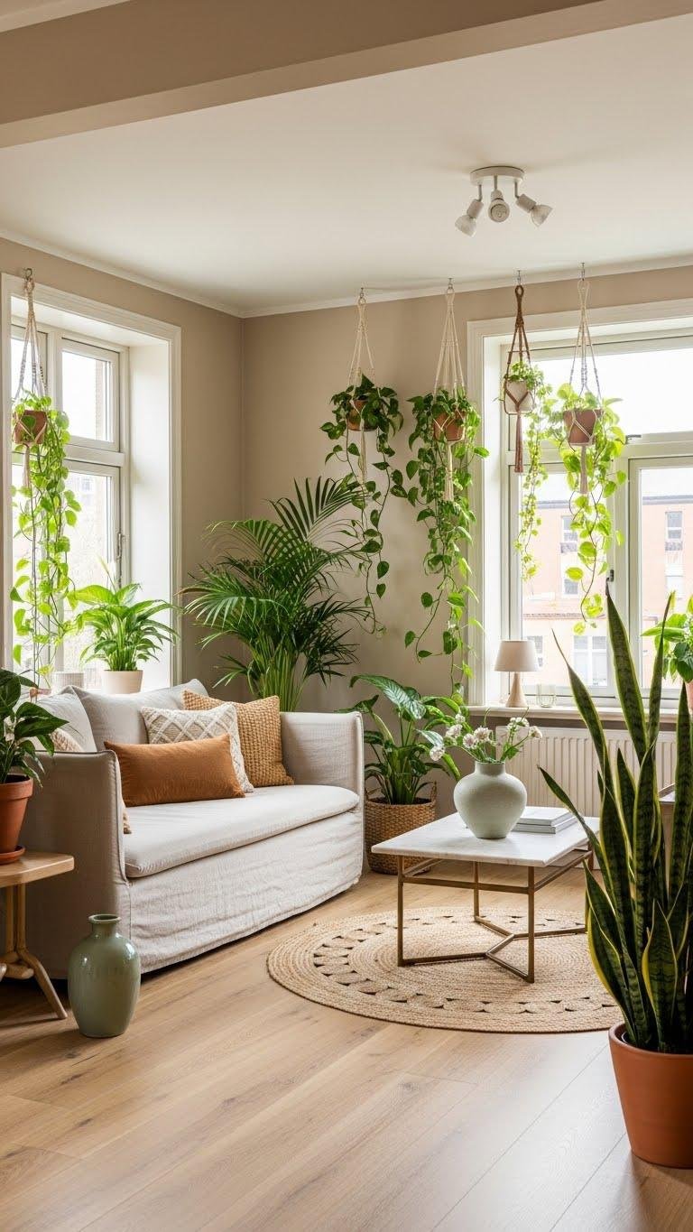 Choose trailing pothos for shelves and macramé hangers to add movement and soft green lines.