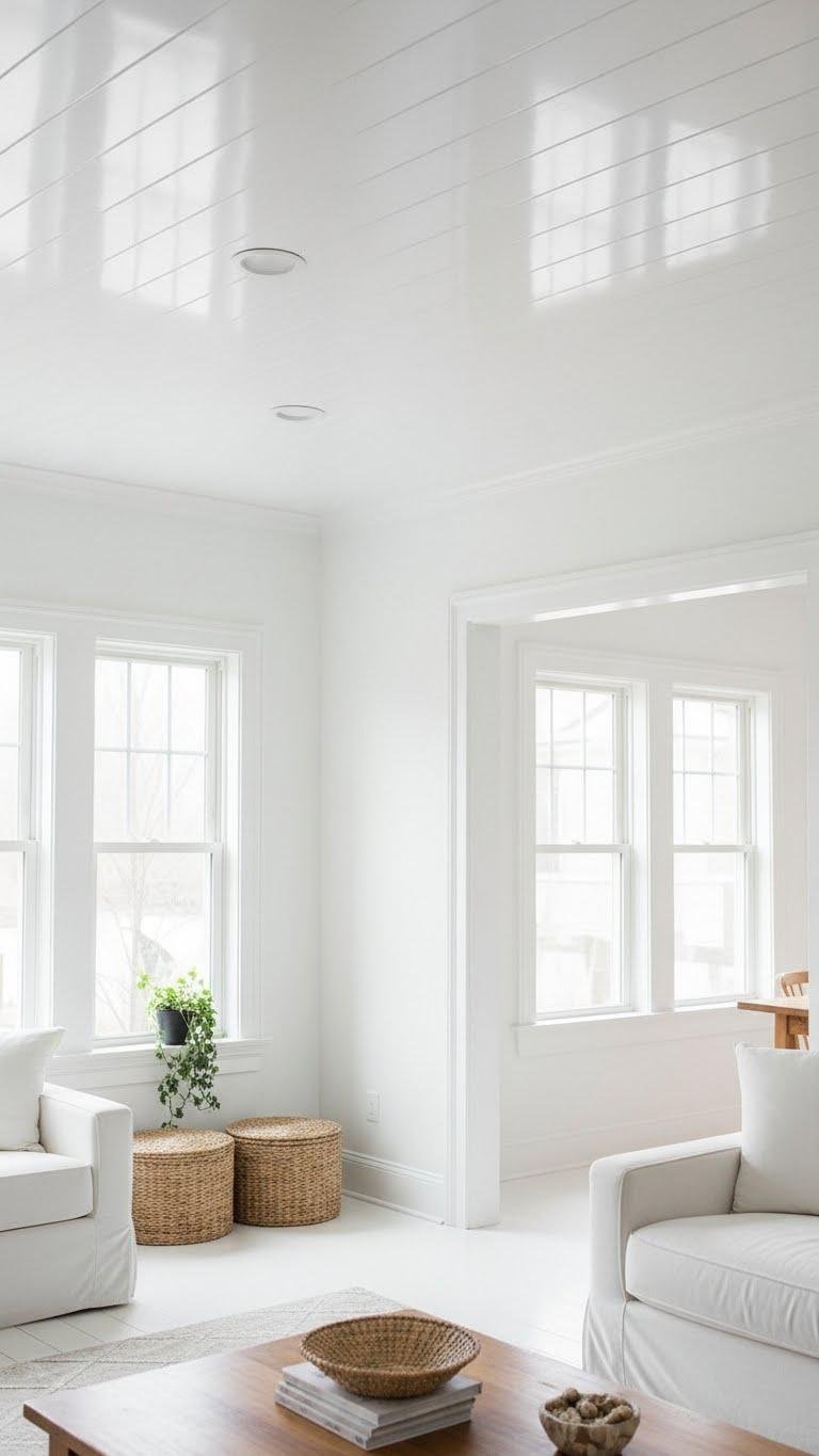 Paint walls in crisp white to reflect light, pair high gloss ceilings for extra bounce, and keep matte trim to frame windows and doors.