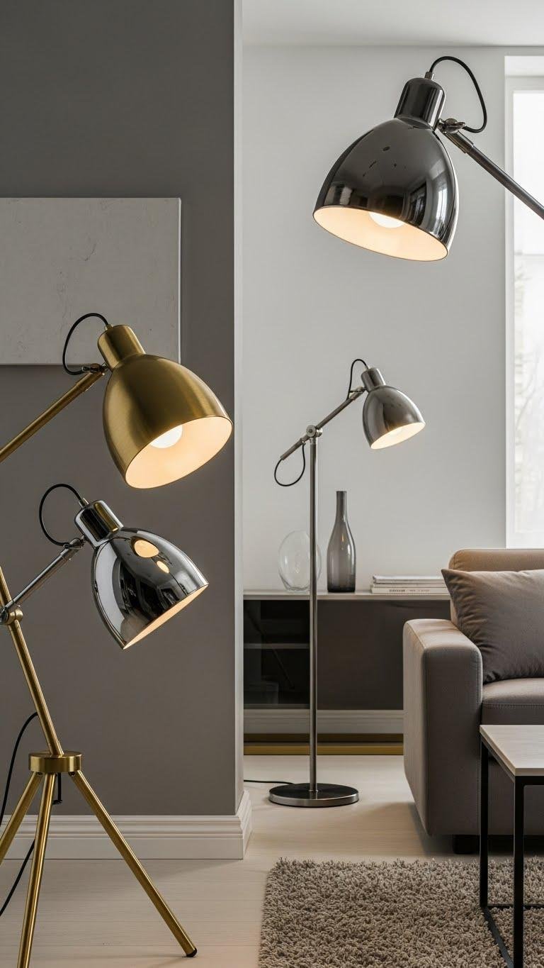 Casting a slight sheen, metal-finish lampshades give a neutral room a refined, modern edge without clashing with soft palettes. You’ll pick a brushed brass for warmth or smoked chrome for cool restraint, placing lamps where light sculpts textures. Choose simple shapes, matte interiors to control glare, and swivel bases for flexibility—small metal details free your space from clutter while staying crisp and intentional.