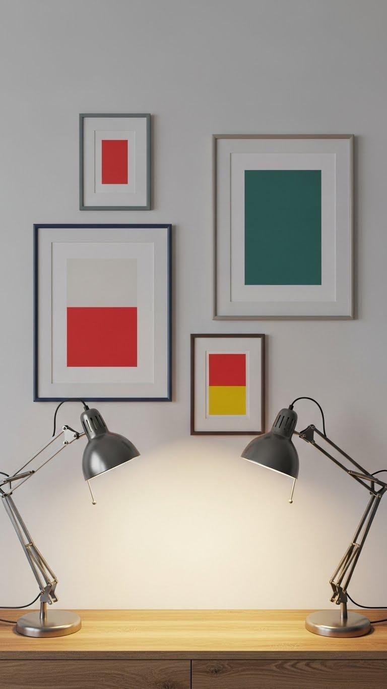 Metal-finish lamps set the mood; minimal artwork ties the color story together. You choose two accent hues and let each piece echo one—an accent repeat that feels intentional, not loud.
